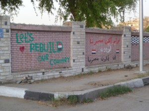 Before the revolution, the Muslim Brotherhood had been a banned, but tolerated, organization. Never would their slogans have been allowed public display for very long. They, like others, are now enjoying a greater freedom of operation. Meanwhile, and not necessarily conversely, others place the Islamic crescent and Christian cross side by side, alongside a heart to validate and honor the two religions of one people.