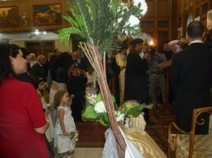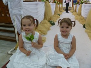 The wedding took place on Sunday night, the day after our enjoyable, yet long, rihla to Anafora. The girls had both gone to preschool that day, then had lunch, then Emma did her homework, and then they played outside a bit before it was time for dinner and getting in their white dresses. Both girls were excited about their role and telling our neighbors all about it. The wedding was supposed to start at 6:00, and we were told to arrive between 5:30 and 5:45. Being the punctual foreigners, we ate dinner, dressed the girls, combed their hair, and hopped in a taxi, arriving at the church around 5:35. The florists were there decorating the church and the videographer and photographer looked to be present, but there wasn’t any sign of anyone else, let alone the organizers. I had the girls sit down on the white aisle runner and snapped a few pictures before anyone arrived.