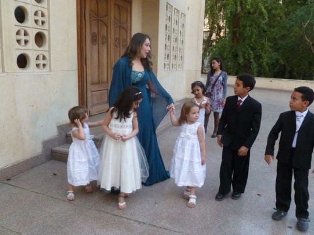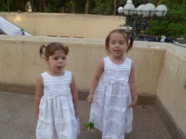 About three weeks ago, one of the Sunday School teachers at the Arabic Evangelical Church of Maadi approached me to ask if Emma could be in the wedding of a fellow teacher. She mentioned the name of the teacher, but said she wasn’t present that day so she couldn’t introduce me. I told the teacher that I would ask Emma, but didn’t think she would want to be in the wedding as she had recently been saying she didn’t want to be in any weddings. Both girls had preformed beautifully as flower girls in their Uncle Aaron’s wedding last fall, but Emma had decided she didn’t like the attention and chose not to be in any more weddings. I promised the teacher I would talk about it with Emma, and as long as the white dress still fit from the previous wedding, I had no objection to her taking part.