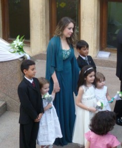 It was about 5:50 when Miss Mary arrived and explained to the girls exactly how to walk with her. It turns out there were other children in the wedding as well, and they would all walk in formation with the one bridesmaid who would be accompanying the bride from the car, up the stairs, and into the church. Once they got into the church, the role of the children was over.