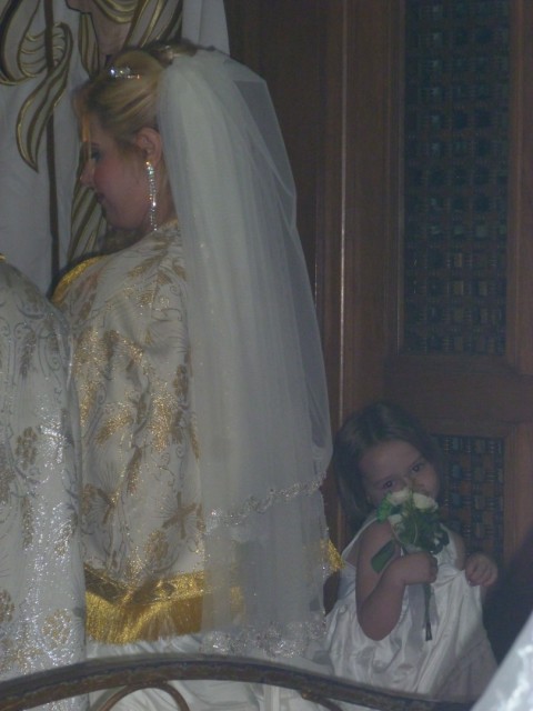 Emma spent most of the ceremony as close as she could to the bride. At one point, Jayson went to the front to take pictures and told me she was standing next to the iconostasis. I couldn’t believe she felt comfortable up front and center where all the attention was focused. Perhaps because it was her choice to be there, she felt okay. I also wondered if it was okay with the bride that Emma was right next to her. I was told later that it was no problem.