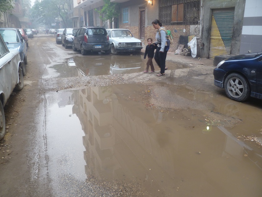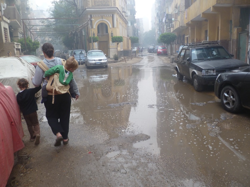 Setting out from our house we avoided the puddle on the street, choosing instead the slightly less muddy path on the sidewalk.Usually Alexander is pushed in a stroller, but today it was wise to leave it behind. The stroller also carries the girls’ backpacks, and it wasn’t long until they got tired of carrying them themselves, and saddled their mother instead.This is the puddle right in front of the entrance to Emma’s and Hannah’s school. The black vehicle is a tuk-tuk, stuck in the mud-mud.Layla often skips along merrily on her way to preschool.But she got a little weary of squeezing through gaps around the puddles.The rain does little but move around Cairo’s trash problem.As we navigate the street approaching Layla’s preschool, Alexander looks on attentively.Ok, we staged this one a bit. It wasn’t absolutely necessary to traverse the speed bump to move along further, but it was a fun picture.