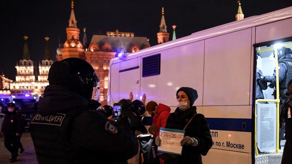 A woman holds a “Stop the war” placard in central Moscow during a protest against Russia’s invasion of Ukraine, on March 3, 2022.