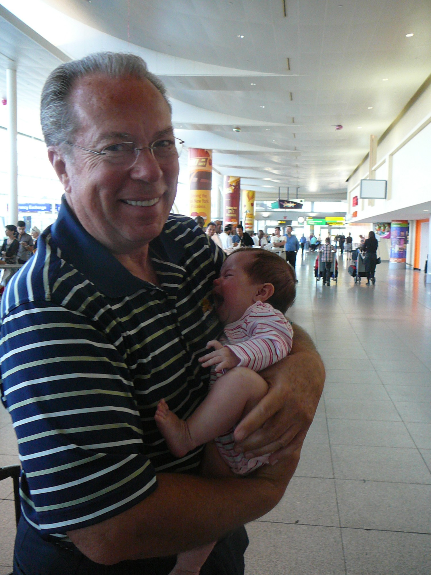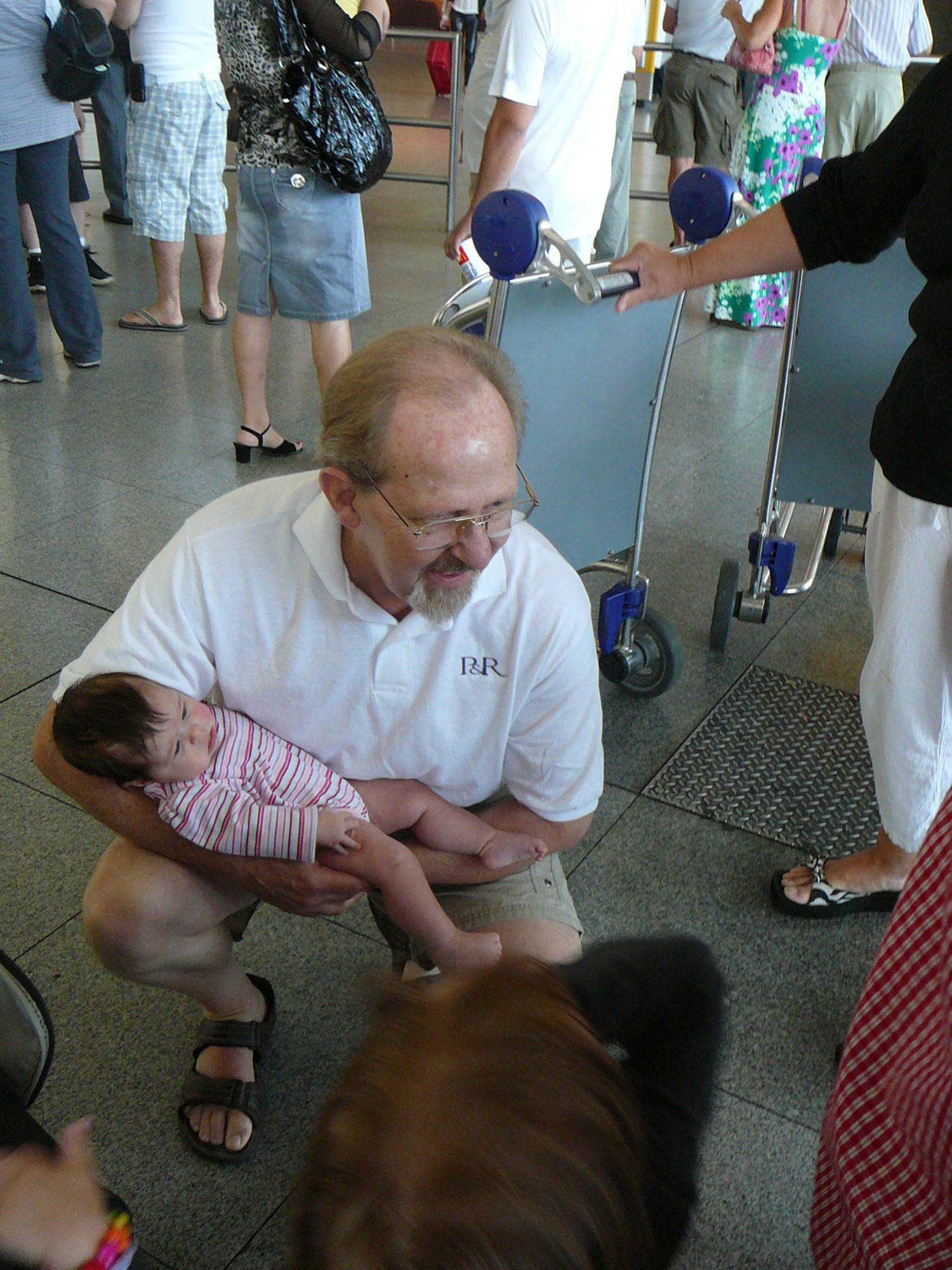 Meeting the four grandparents at the airport washed away all the tiredness and frustration for awhile, as the girls ran up and gave squeezes to all. It was the first time the two grandfathers got to meet our newborn, so the cameras were busy capturing those moments.