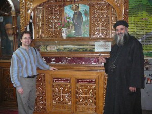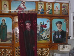 Here are his relics, to which people come to seek his intercession. Behind the priest on the green board is the Arabic text of a song of praise to Abd al-Masih, which commemorates his virtues.