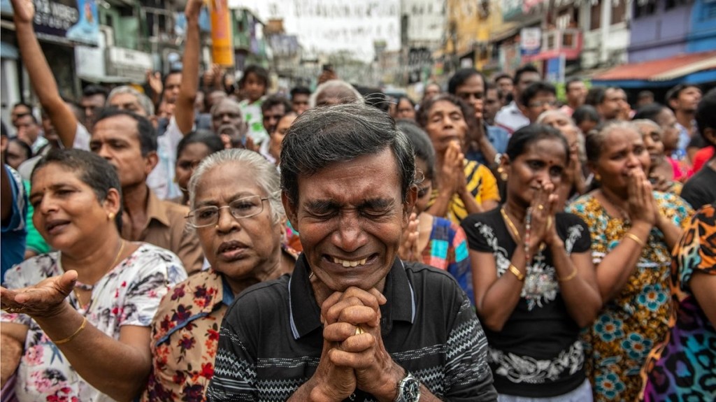 A man cries as he prays in the street near St. Anthony’s Shrine one week on from Easter terrorism attacks that killed more than 250 people, on April 28, 2019 in Colombo, Sri Lanka
