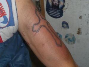 Ghobrial contributes to the ministry with his skills and time. He is present at the monastery every Friday and Sunday for services, charging around $4 US for a cross tattoo and $25 US for a more elaborate tattoo, such as in the picture below.