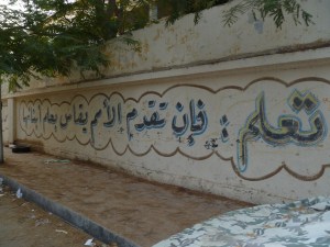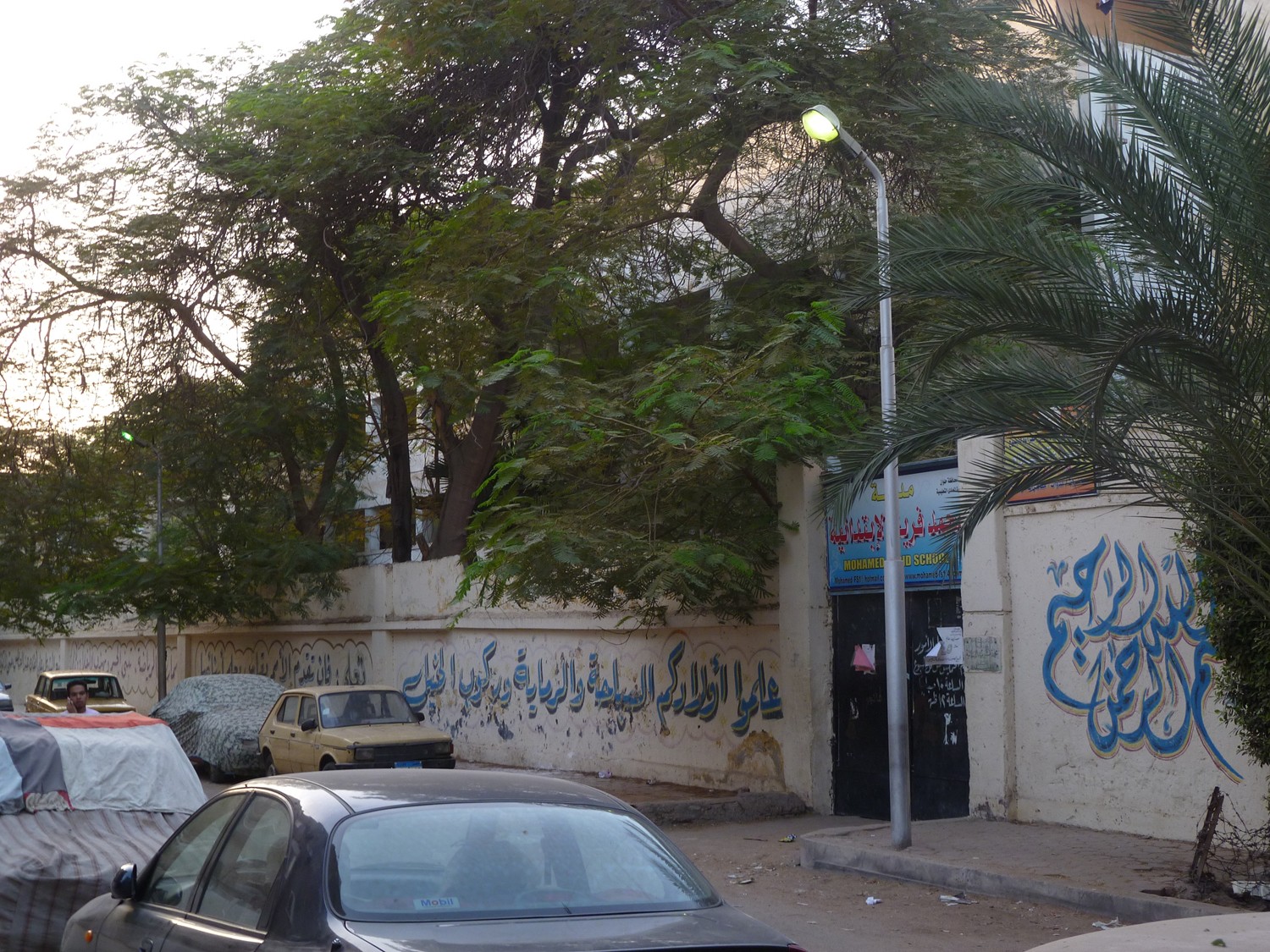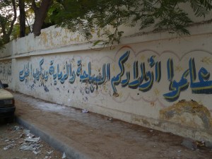 This is the entrance to the school, and the elaborate calligraphy to the right of the door reads: In the name of God, the merciful, the compassionate. This is a common Islamic invocation, used often to begin a speech or introduce a text. As best I can tell, though, this school is a government school, and therefore consists of both Muslim and Christian students. Government education has mandatory religious classes, which are divided according to religion. So while there is nothing in the invocation on the wall that would offend Christian sensibility, it is recognized as a distinctive Muslim formulation.