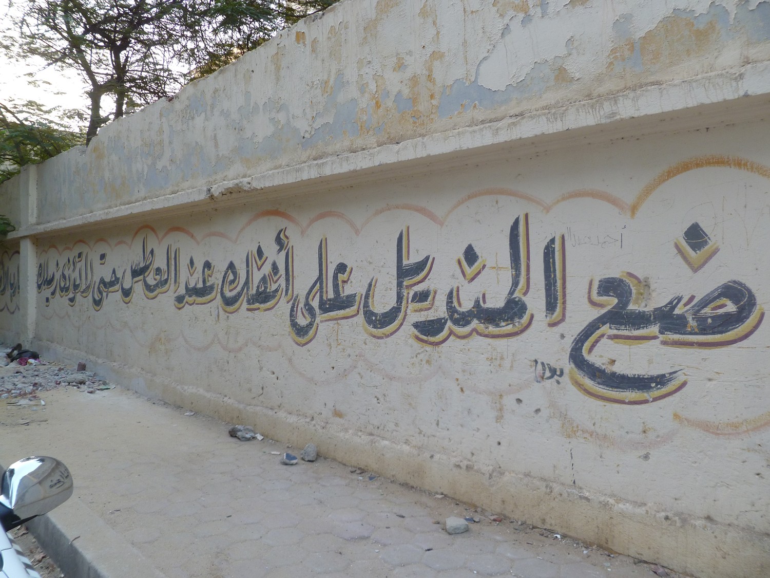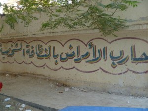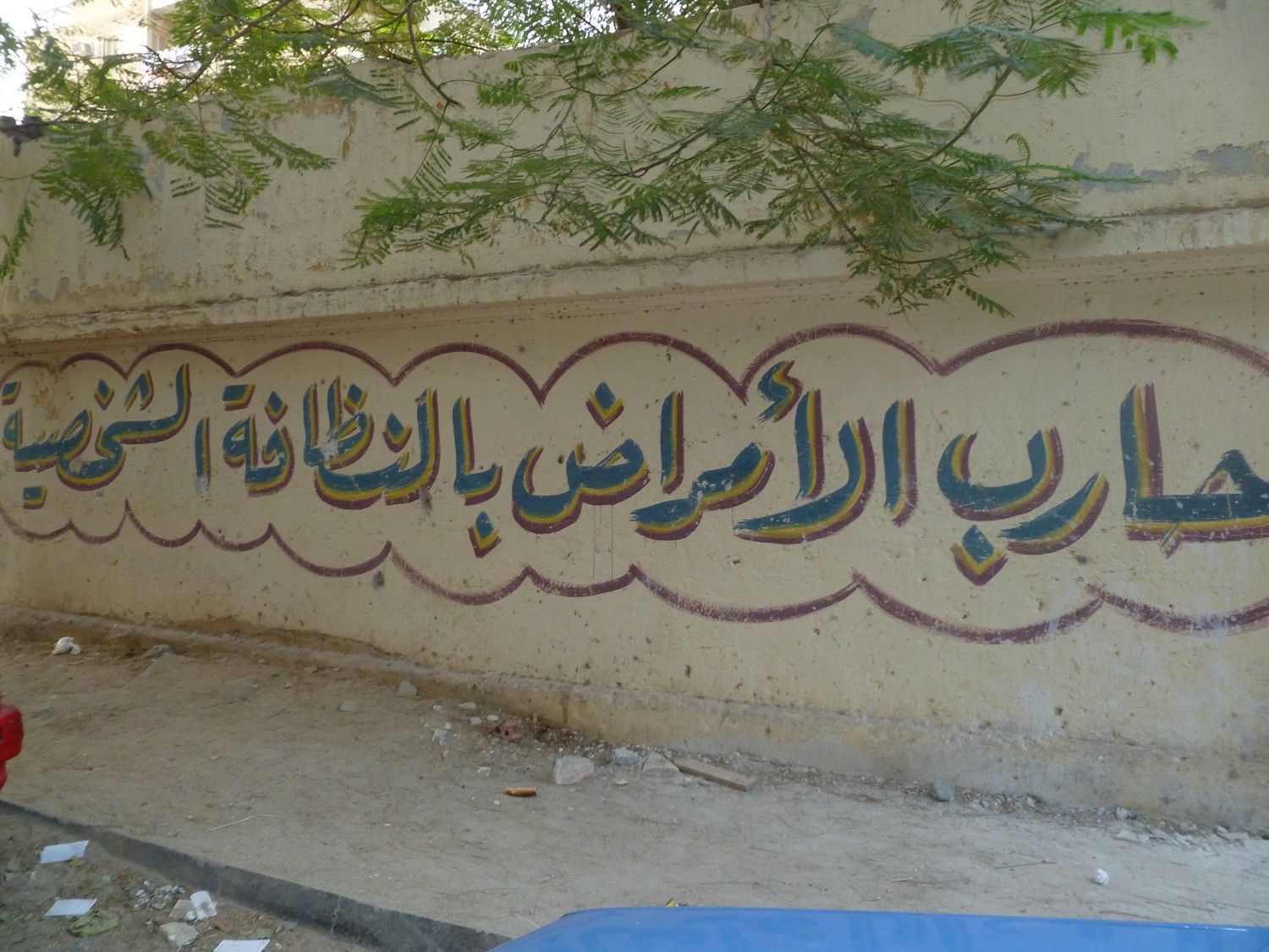 The swine flu virus terrified Egypt. I do not know if this slogan predates its onset or not, but there were extensive public education campaigns on how to avoid contagion. Many schools were shut down if certain children tested positive. Upon arrival, airline travelers were asked to submit to a special medical card, and those with fever were pulled aside for further testing. Less effectively, they also killed all the pigs in the garbage district, complicating natural recycling methods. These slogans were meant to promote good hygiene among the students.