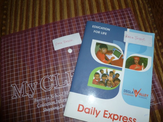 In Egypt, everyone, girls included, uses their father’s name as their second name. Therefore, Emma is known as Emma Jayson in her school. Both names are foreign to them, but now they have seen them written by me, and at least spell Emma right on her crafts.