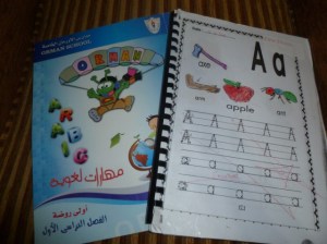 It seems that the children learn the Arabic and English alphabets as well as their numbers, colors and shapes, during KG1. Learning the letters means writing the letters, and that is most of the homework that Emma has brought home. She is not so overwhelmed by writing the English letters, but every day that she has Arabic class, she has to write a new letter along with the three vowels of Arabic, and it turns out to be a bit much. I am trying to learn what motivates her to help her push through and finish her homework each day. It has been an adjustment going from the carefree life of preschool to five days a week “real” school with homework. And it may not help that the weather is usually in the 80s or 90s by the time we are finished lunch and ready to begin the homework.