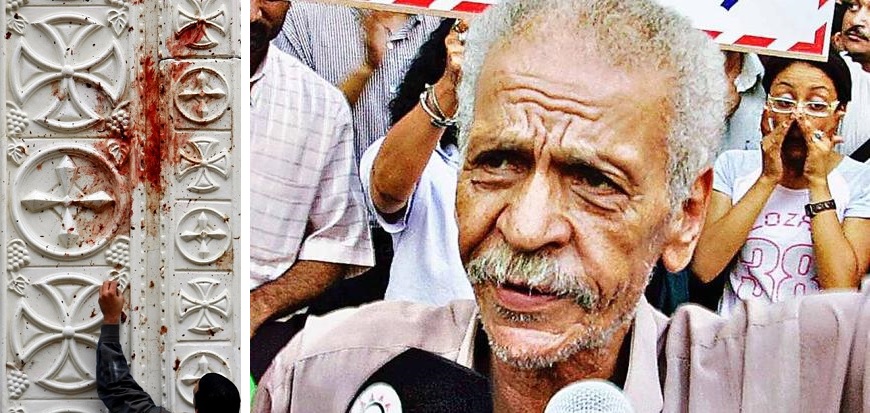 Blood on the church wall in Alexandria (L); Poet Ahmed Fouad Negm (R)