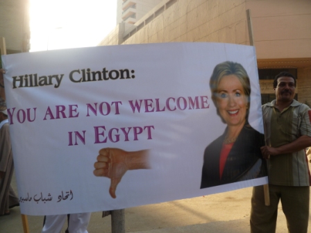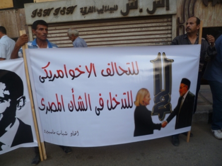 Translation: No to the Brotherhood-American Alliance to Interfere in Egyptian Issues. (Pictured: Hillary Clinton and MB General Guide Mohamed Badie)