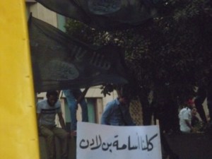 The atmosphere was charged, but calm and peaceful. Even so, offensive chants were issued and questionable signs displayed. Foreign Copts were called ‘pigs’, and the Jews were warned about the soon return of Muhammad’s army. One sign declared, ‘We are all bin Laden, you (Coptic) dogs of the diaspora,’ another celebrated the heroes of September 11, asking God’s mercy upon them. Please click here for a brief video of the protest, and pictures follow below.