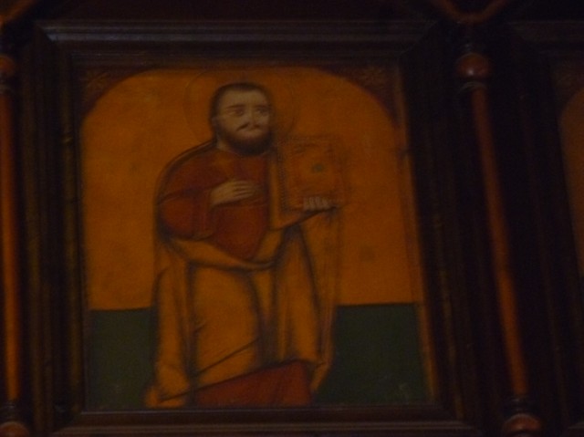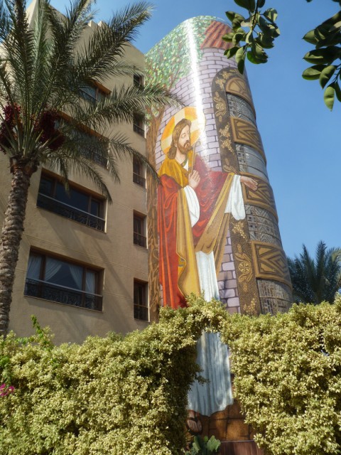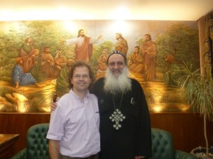 Overlooking the garden grounds from the guesthouse is a giant mural of St. Mina.On the other side is a giant mural of Jesus.The guesthouse contains a large meeting hall. It hosted an area wide youth meeting as well as a priests’ election planning meeting while I resided there.In the foreground is an 18th Century church, rebuilt several times since then. Behind it are the older cells for meditating visitors.The church’s icons were painted to highlight the ‘Eastern’ character of Christianity, to highlight the religion’s diversity.The garden contains life-size statues of the Holy Family nativity scene…… and of their Flight to Egypt.It also has a very romantic bridge crossing over a lagoon. The couple should take care of the Virgin Mary watching from above the waterfall.The entire garden complex, pictured within the surrounding village farmland.Me and Bishop Boula, inside his office at the monastery.